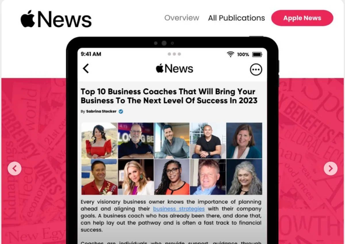 I was number two in the Top 10 Business Coaches of 2023 on Apple News. Since then, I got a press kit, I got all kinds of information on how to utilise the information that they gave me, which gave me tons of ammo to really increase my status and just make sure everyone understood that I got this honor. They've given me tons of advice and tons of counsel.